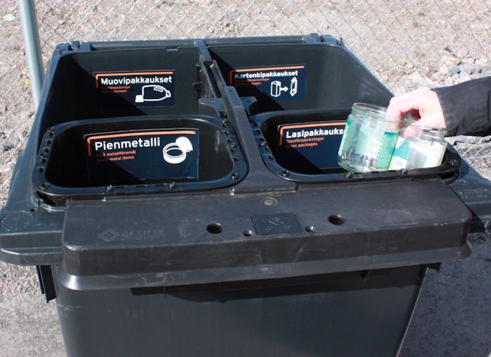 Nelilokeroiseen jäteastiaan voi lajitella muovi- ja kartonkipakkaukset sekä lasin ja pienmetallin.