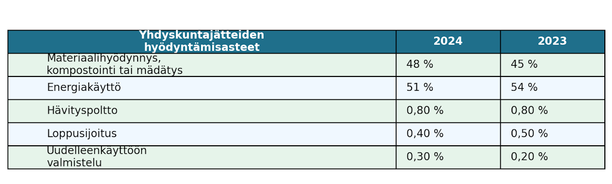 Energiahyötykäyttöön kaikista yhdyskuntajätteistä ohjautui vuonna 2024 noin 51 prosenttia. Vuonna 2023 energiahyötykäyttöaste oli 54 prosenttia, joten energiakäytön osuus on pienentynyt ja kierrätyksen osuus kasvanut.