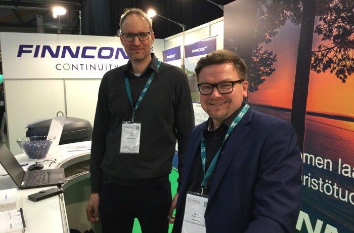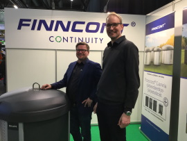 Kuvat: Elina Saarinen. Kari Leppälä ja Mikko Kärkkäinen esittelevät mielellään Finncontin laajaa tuotevalikoimaa. Finncont tarjoaa asiakkailleen turvalliset ja kestävät teollisuussäiliöt, jätehuolto- ja ympäristötuotteet, Finncont Luowia ja Blok -jätteenkeräysjärjestelmät, kiinteistöhuoltotuotteet, lavat, puristimet ja jätepakkaajat sekä Finncont-polttoainesäiliöt.