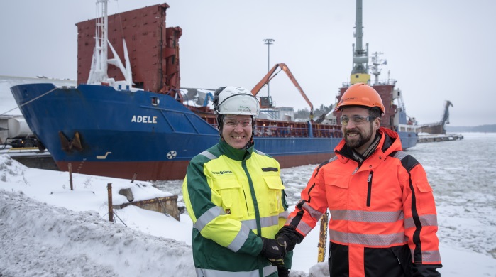 Kuva: Fortum/ Riku Isohella. Fortumin Tero Holländer ja Cronimet Nordicin Kristoffer Retva valmistautuivat ensimmäisen metalliromulaivalastin lähtöön.