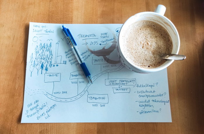 Euroopan aluekehitysrahaston, Suomussalmen kunnan ja Loiste Lämpö Oy:n rahoittamassa ja Kajaanin ammattikorkeakoulun hallinnoimassa Kaukolämmön vähähiiliset ratkaisut –hankkeessa ollaankin lähdetty liikkeelle perusasioista, ja tiivistämään hiilineutraaliustavoitteita konkreettisen toimenpidesuunnitelman muotoon. Vanha, ja hyväksi todettu tapa hahmottaa uusia asioita on vetää esiin kynä ja paperia.