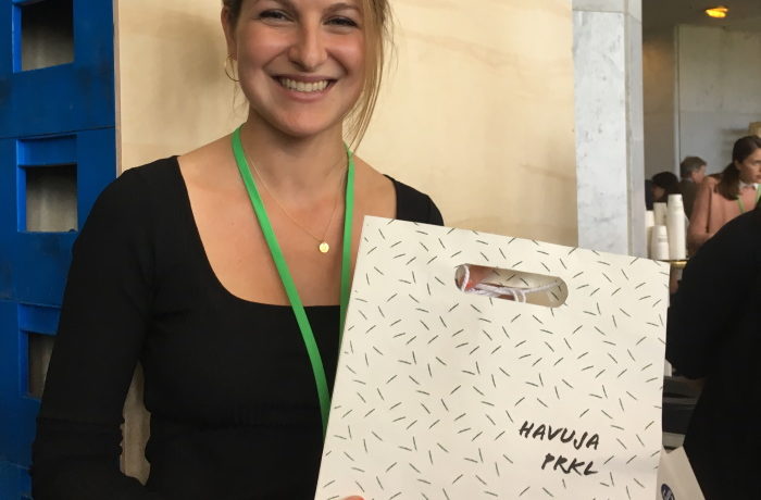 Kuva: Elina Saarinen. Daniela Bqain esitteli Papticin kierrätettävää, puukuiduista valmistettua kassia World Circular Economy Forumissa Helsingissä.