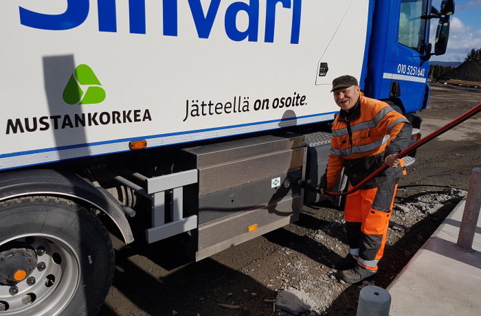 Kuva: Mustankorkea/ Petra Thurén. Sihvarin jäteautonkuljettaja Tero Oksanen tankkasi Mustankorkean jätekeskuksella, Gasumin väliaikaisella tankkauskontilla, biokaasua vuonna 2017.
