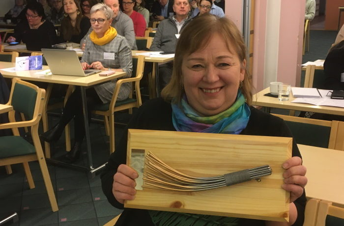 Kuva: Elina Saarinen. Eija Kinnunen vastaanotti Kultainen Luuta -ympäristöpalkinnon tammikuun lopussa Levillä Pidä Lappi Siistinä ry:n järjestämässä ympäristöseminaarissa, jonne saapui ennätysyleisö.