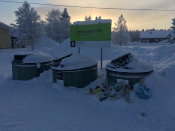 Kuvat: Elina Saarinen. Jounin kaupan yhteydessä oleva RINKI-ekopiste on suosittu Ylläksellä, sillä pisteellä on puristimella varustettu keräysastia myös muovipakkauksille. Lasia oli tammi-helmikuun vaihteessa kertynyt niin paljon, että astia pursusi yli.