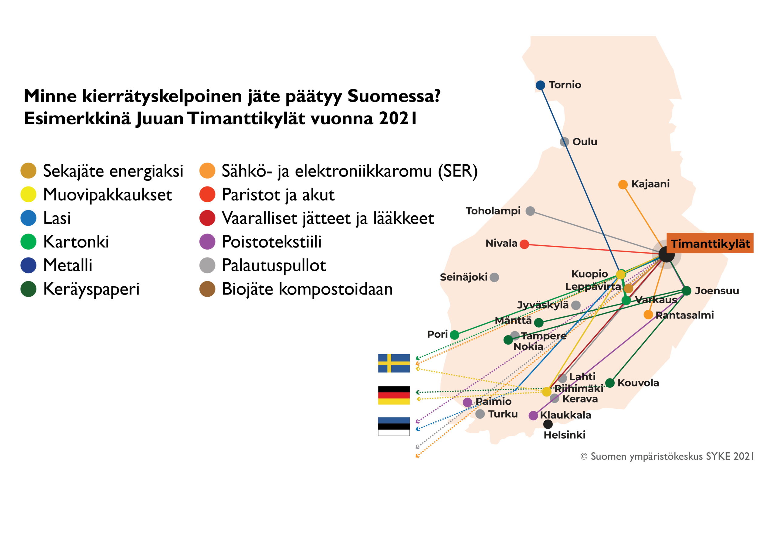 Timanttikylien jätereitit ovat vain yksi esimerkki. Jätteet päätyvät hieman eri paikkoihin riippuen siitä, missä päin Suomea ne kerätään.