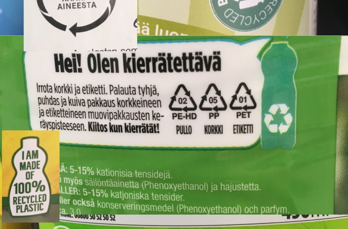 Kuva: Elina Saarinen. Markkinoilla on paljon erilaisia, kierrätysaiheisia merkkejä. Kuluttaja ei voi olla varma, milloin merkki tarkoittaa kierrätysraaka-aineesta valmistettua, milloin vain kierrätyskelpoista.