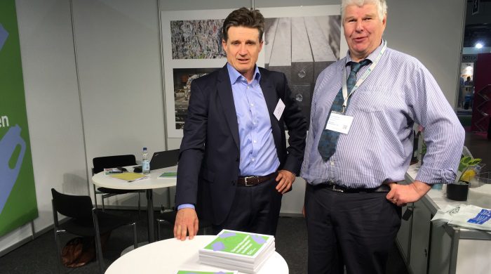 Kuva: Elina Saarinen. Suomen Uusiomuovin kehitysjohtaja Peter Rasmussen ja toimitusjohtaja Vesa Soini esittelevät tuoretta opasta PacTec-messuilla Helsingissä.