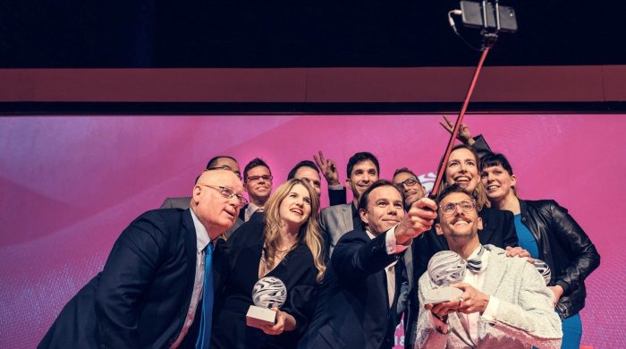Kuva: H&M Foundation. Voittajat poseerasivat selfiessä säätiön Karl-Johan Perssonin kanssa.