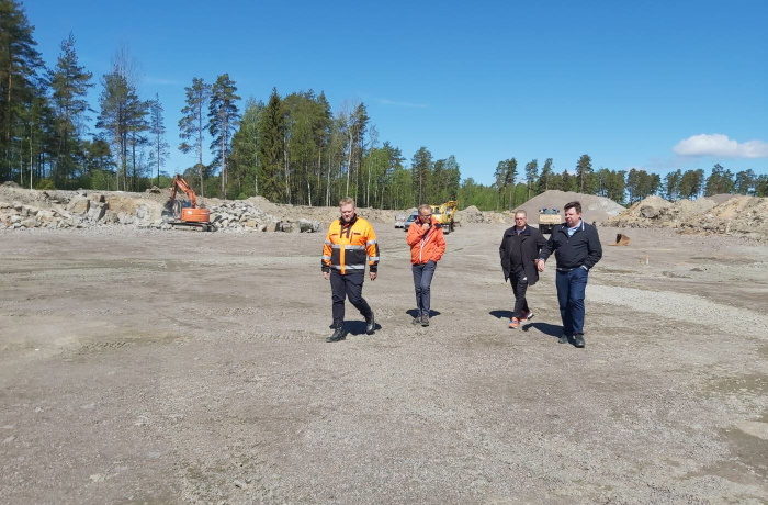 Kuva: Doranova. Doranovan Mikko Saalasti, Biopir Oy:n Jyrki Heilä ja Jari Kaskinen sekä mädätejäännössäiliöt toimittavan Mestarifarmin Arto Nummila laitostyömaalla.