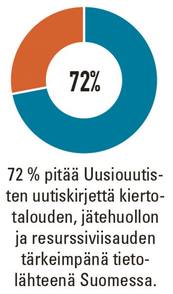- Uusiouutiset-mediaan kuuluu myös sähköisiä kanavia kuten uutiskirje. Uutiskirjeen lukijoista suurin osa on kiertotalous-, jätehuolto- ja ympäristöalojen kokoeneita ammattilaisia: joka kolmas lukija on työskennellyt alalla yli 11 vuotta. (Tietolähde: Lukijatutkimus 2019/ JHelske Research).