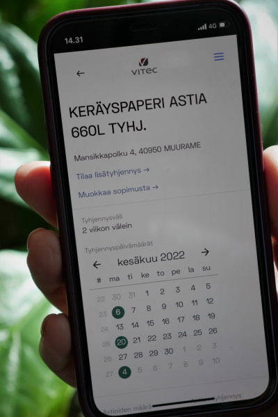 Kirjauduttuaan palveluun asiakas näkee omat sopimus- ja laskutustietonsa sekä tilaamansa jätehuoltopalvelut. Jäteastian seuraavan tyhjennysajankohdan selvittäminen ei enää vaadi jonottamista puhelimessa, vaan asiakas löytää haluamansa tiedon nopeasti itse.