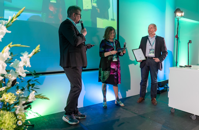 Kuva: Kiertotalouskeskus. Petri Alava vastaanotti palkinnon Tuomas Pussilalta ja Soile Suvannolta Kemissä.